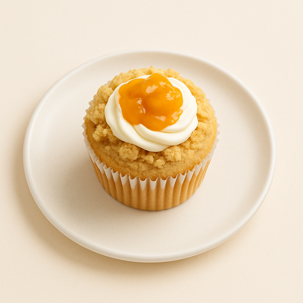 Peach cupcake with vanilla frosting and peach preserves.